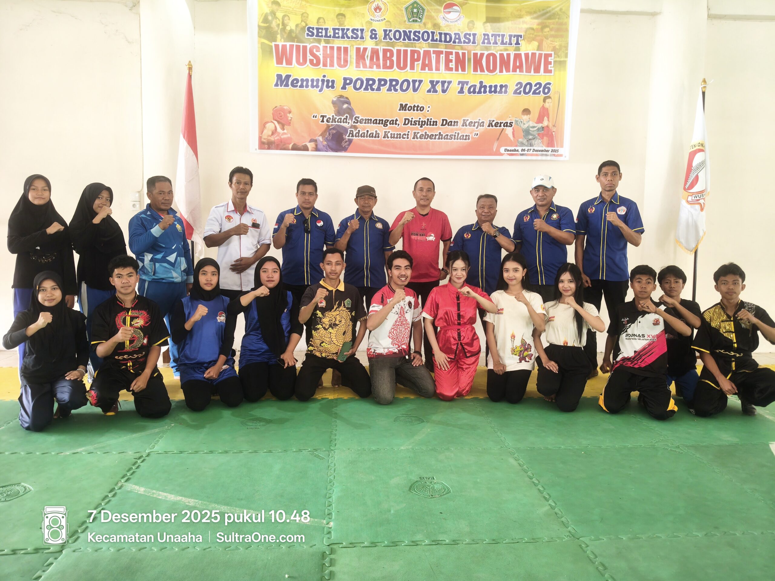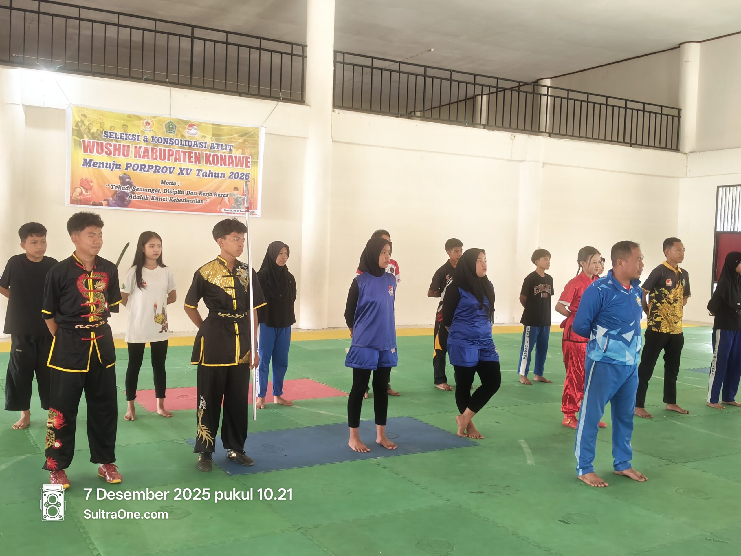 SULTRAONE.com.Konawe – Cabang olahraga Wushu Kabupaten Konawe mulai memanaskan mesin menuju Pekan Olahraga Provinsi (Porprov) Sulawesi Tenggara XV tahun 2026. Dengan mengangkat motto “Tekad, Semangat, Disiplin dan Kerja Keras adalah Kunci Keberhasilan”, Pengcab Wushu Konawe menggelar seleksi serta konsolidasi atlet pada akhir pekan ini.