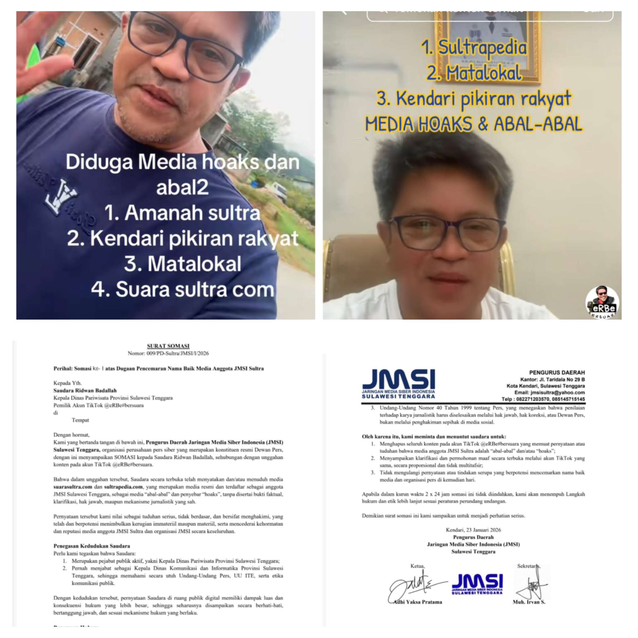 Somasi dilayangkan menyusul unggahan akun TikTok @eRBeBersuara, yang diketahui dimiliki oleh Ridwan Badallah, yang diduga mencatut dan melabeli dua media anggota JMSI Sultra, yakni Suarasultra.com dan Sultrapedia.com, sebagai media “abal-abal” dan penyebar hoaks.