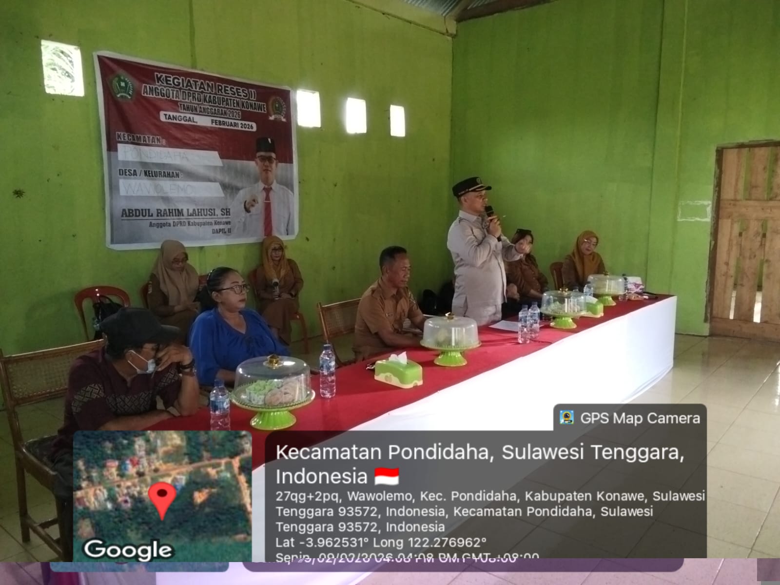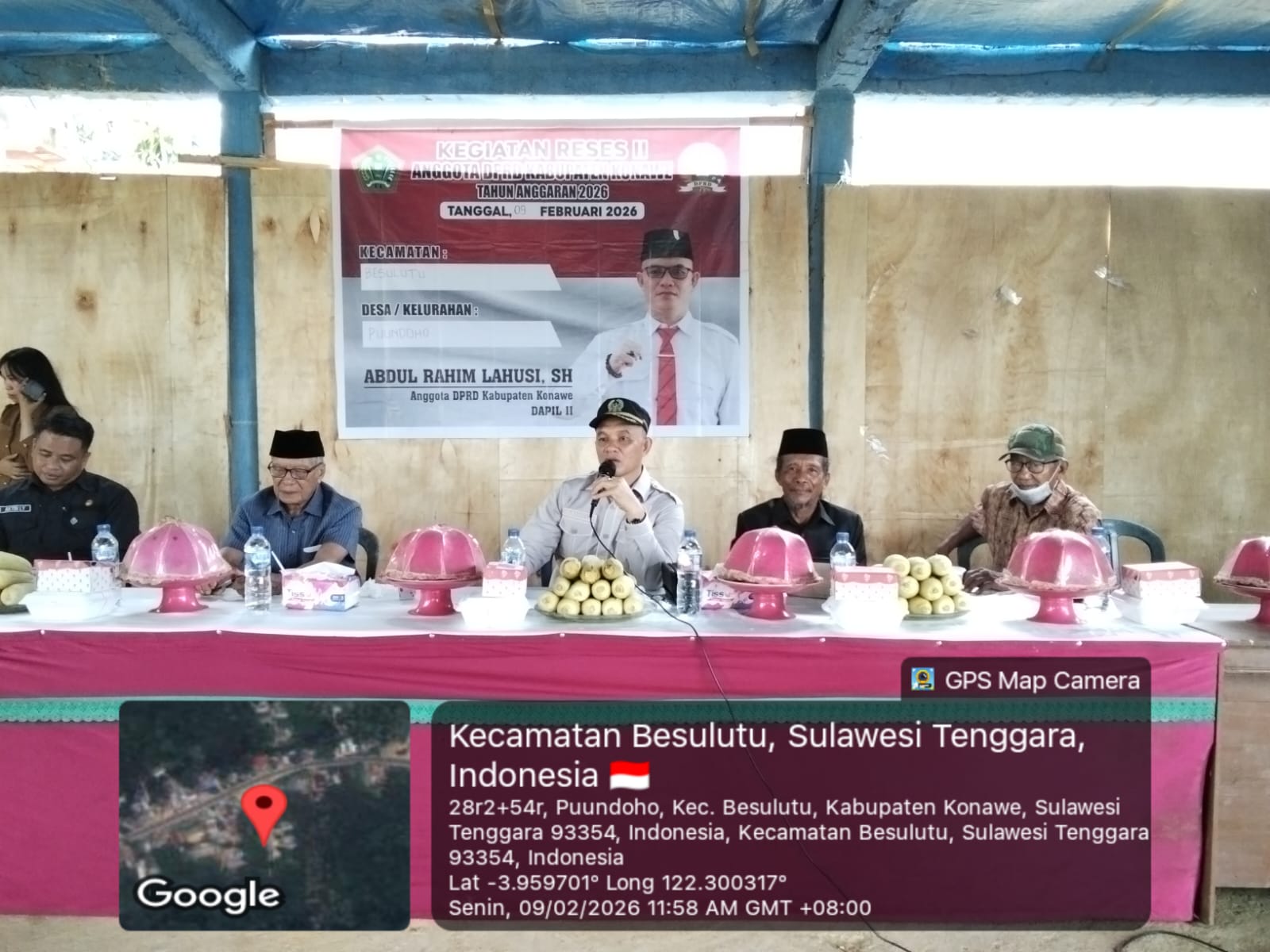 SULTRAONE.com.KONAWE – Anggota Dewan Perwakilan Rakyat Daerah (DPRD) Kabupaten Konawe, Abdul Rahim Lahusi, SH,dari Fraksi PDI Perjuangan Dapil 2 kembali turun langsung ke tengah masyarakat dengan menggelar Reses II Tahun Anggaran 2026 di dua titik berbeda, yakni Desa Puundoho, Kecamatan Besulutu dan Desa Wawolemo, Kecamatan Pondidaha, Senin (09/02/2026).