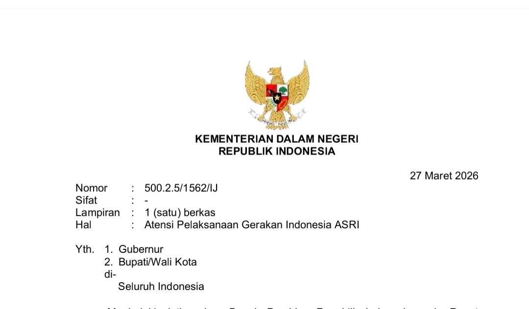 Apresiasi tersebut tertuang dalam surat Kemendagri RI Nomor 500.2.5/1562/IJ tertanggal 27 Maret 2026 yang ditujukan kepada gubernur, bupati, dan wali kota di seluruh Indonesia.