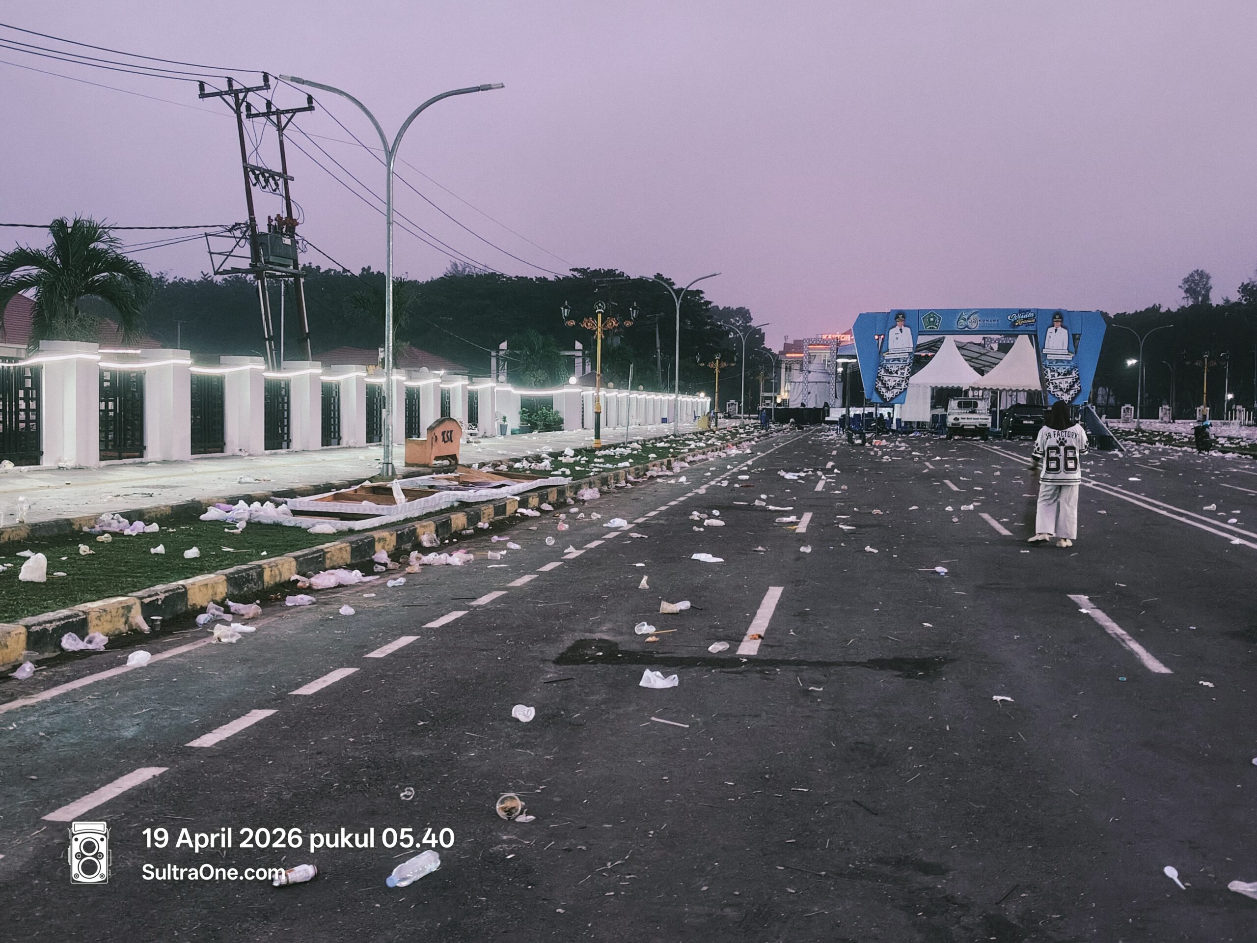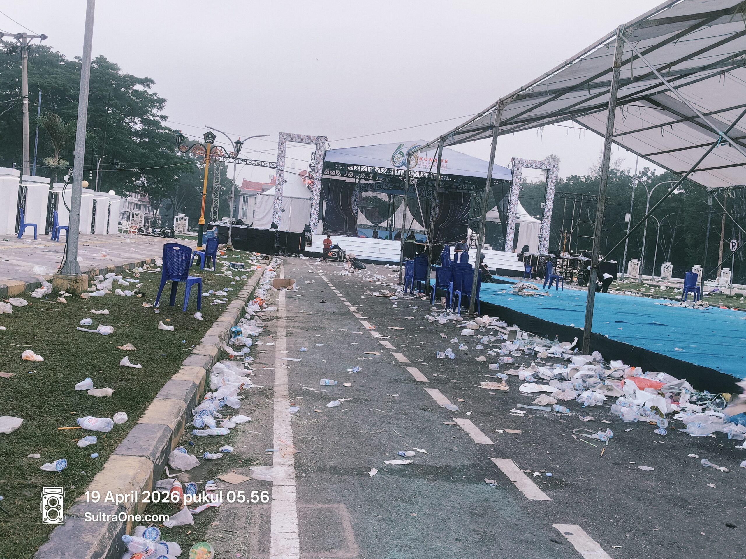 Usai acara penutupan HUT Konawe yang dipadati ribuan warga, kawasan ICP berubah drastis. Botol air mineral, gelas plastik, kantong kresek, sisa makanan, kertas, hingga material dekorasi acara tampak berserakan di berbagai sudut taman dan sekitar panggung utama.